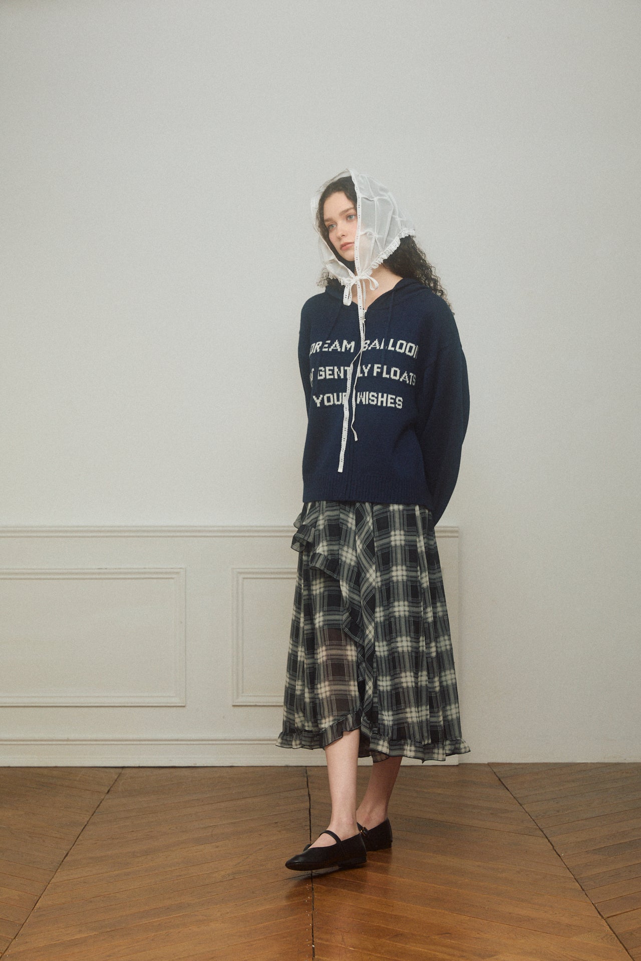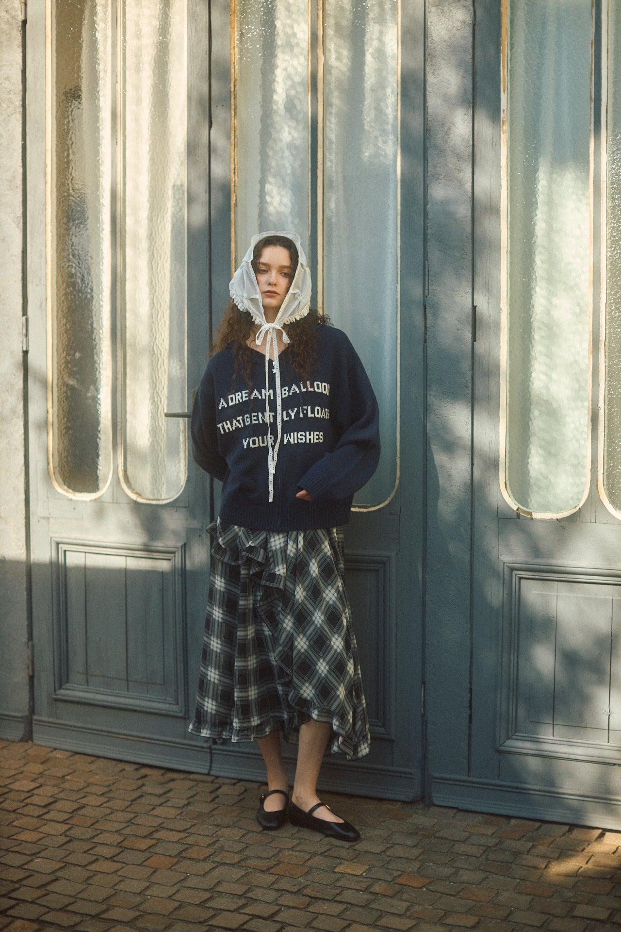 軽やかなシフォン素材に、チェック柄を重ねたアシンメトリーデザインのスカート。動きのあるフリルと計算されたアンバランスさがスタイリングに自然な奥行きを与え、落ち着いた配色のチェック柄がアクセントに。