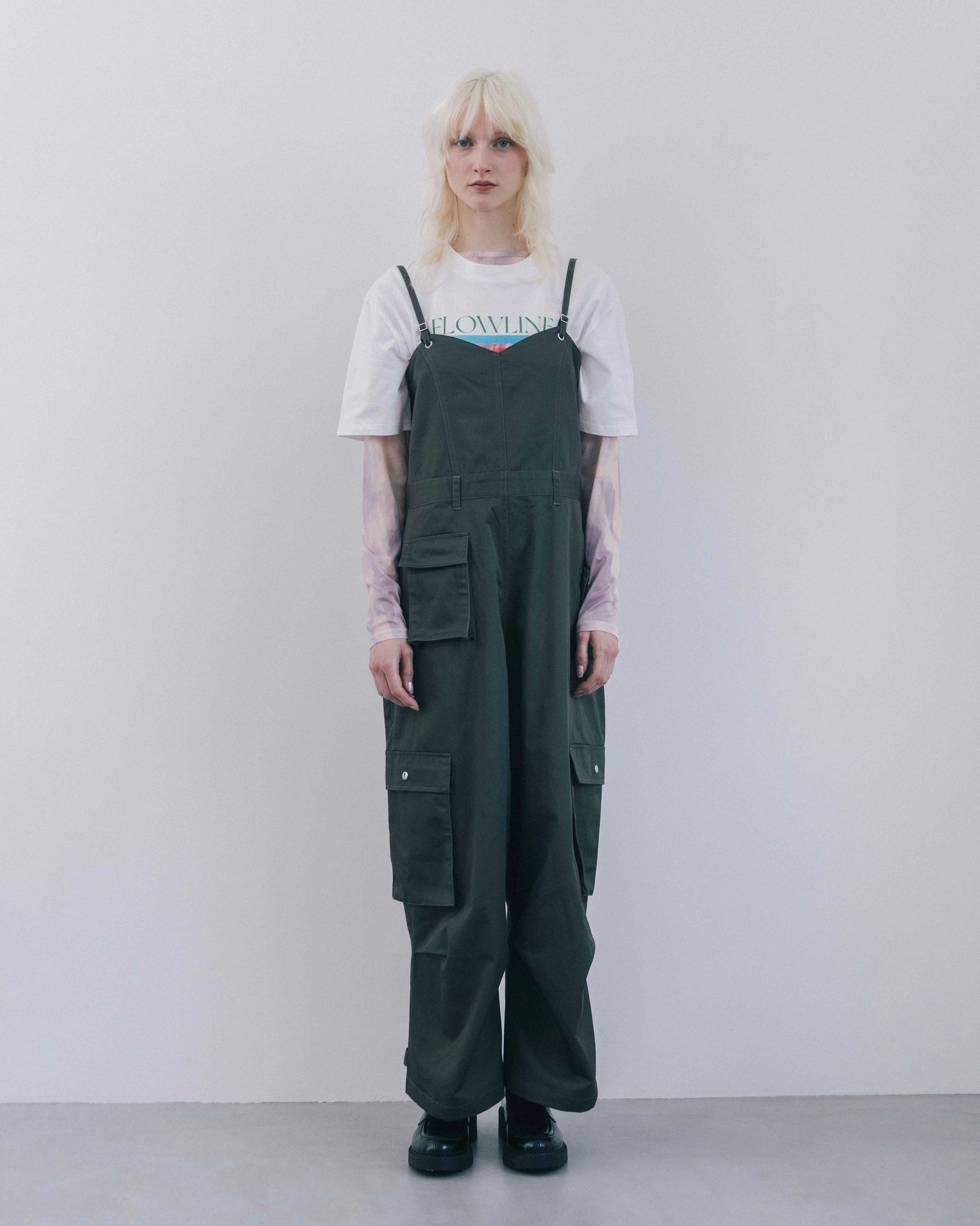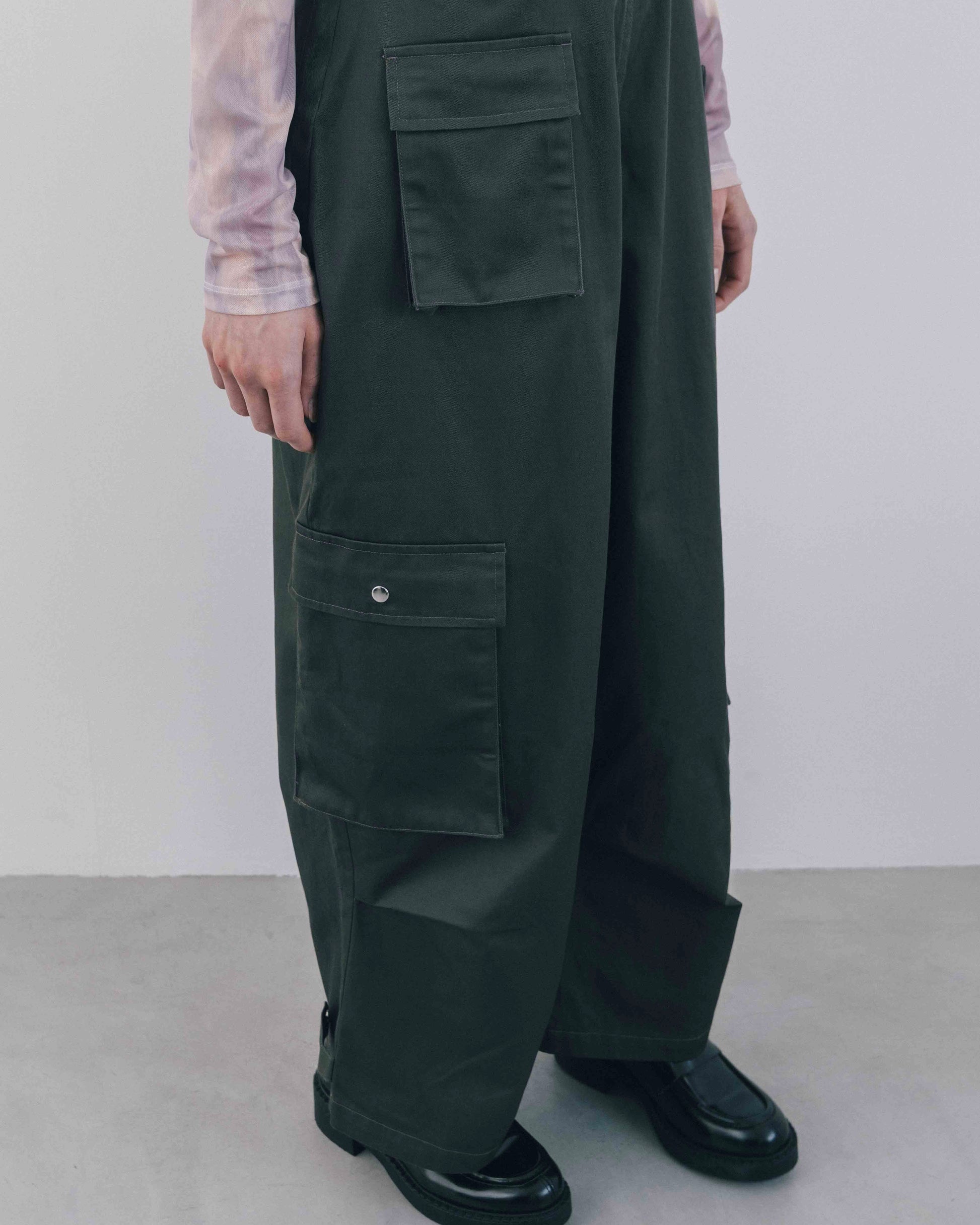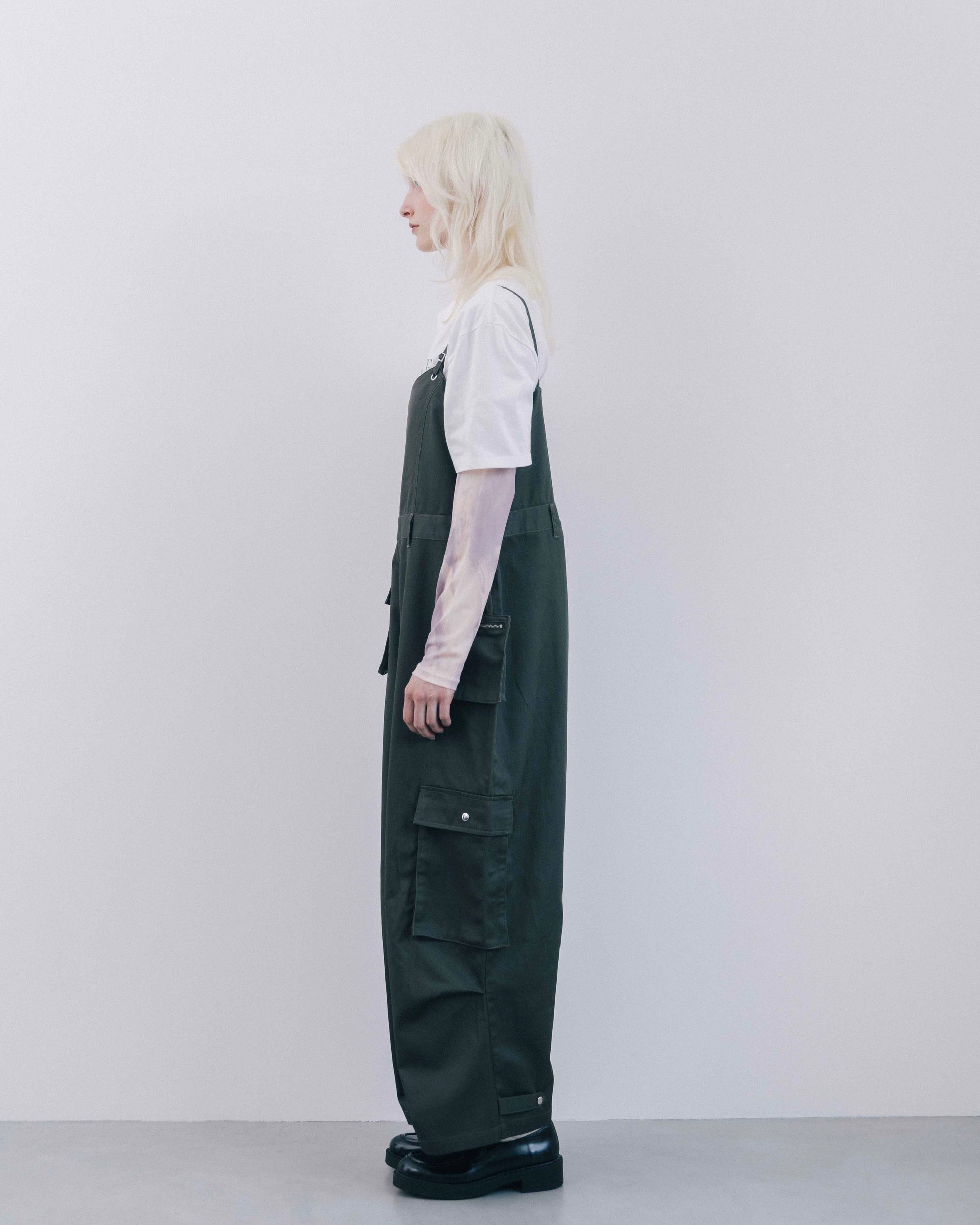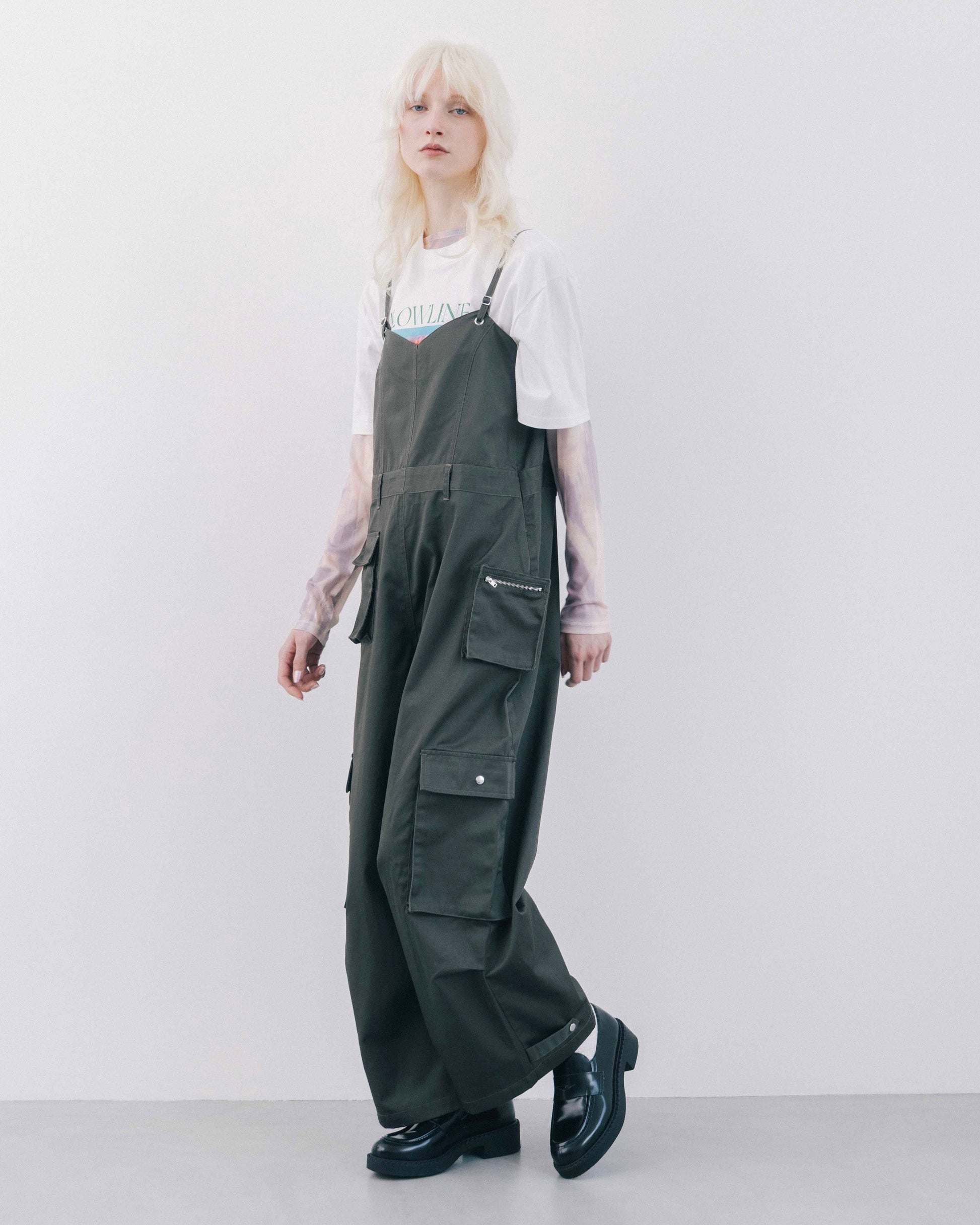 程よくラフな印象を持たせながら、全体的にデザイン性を効かせたカーゴオールインワン。