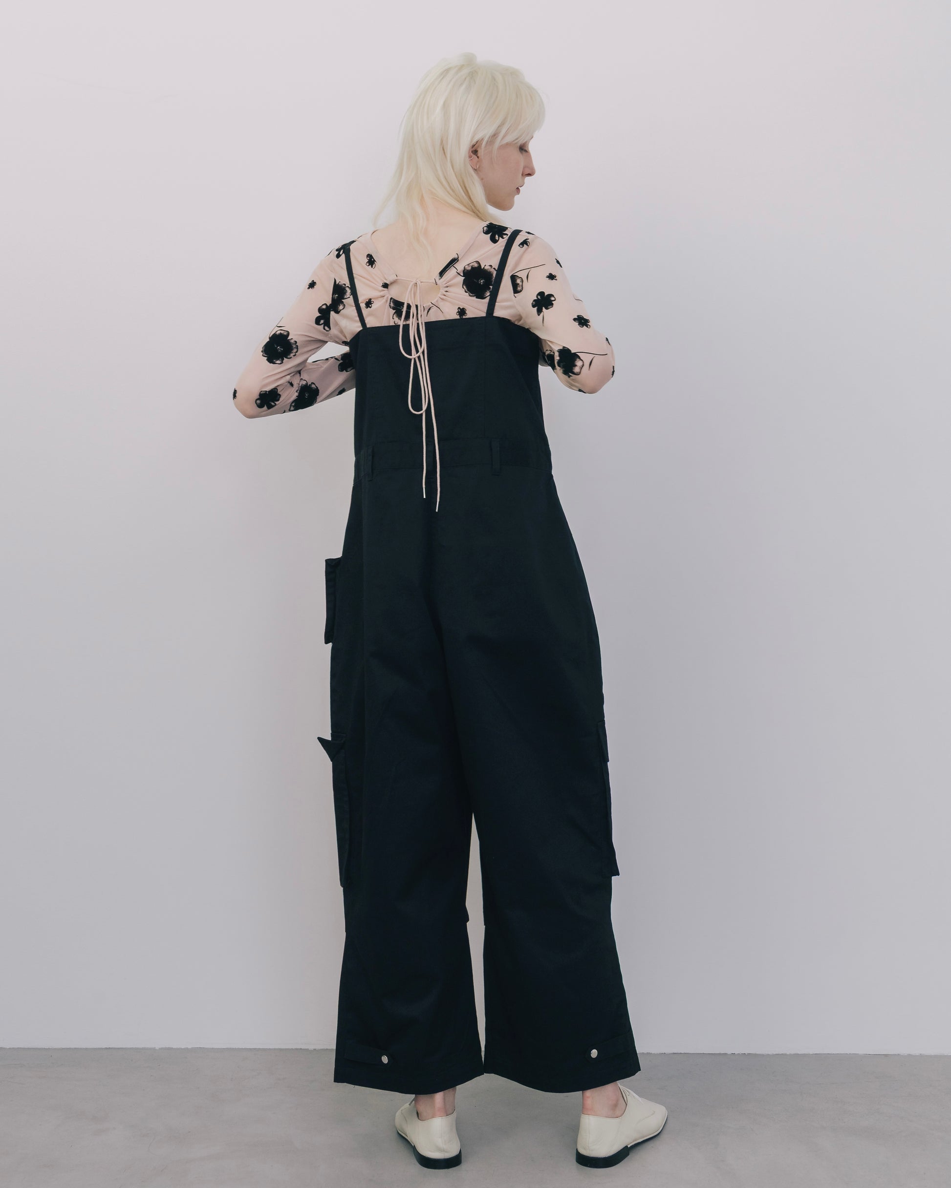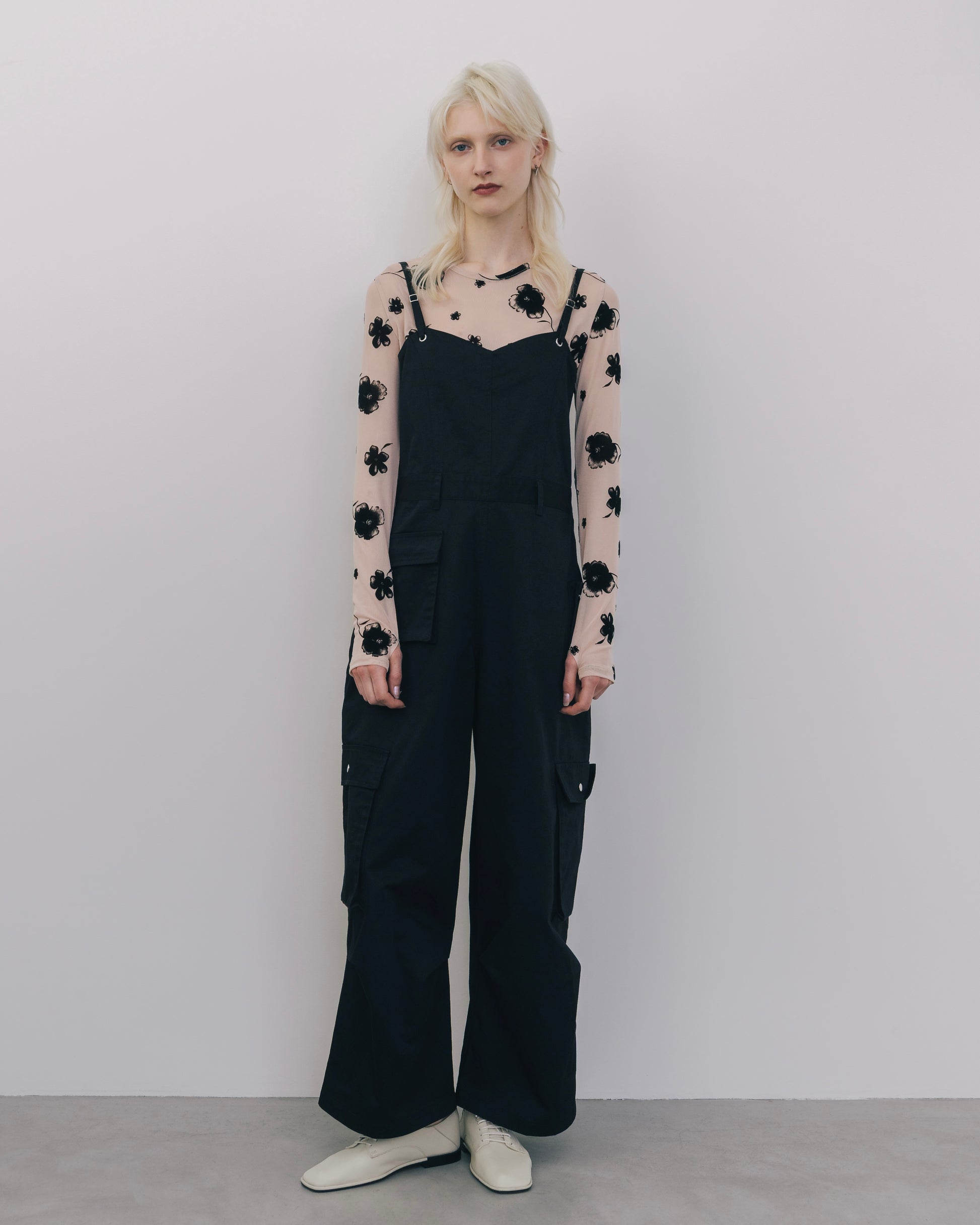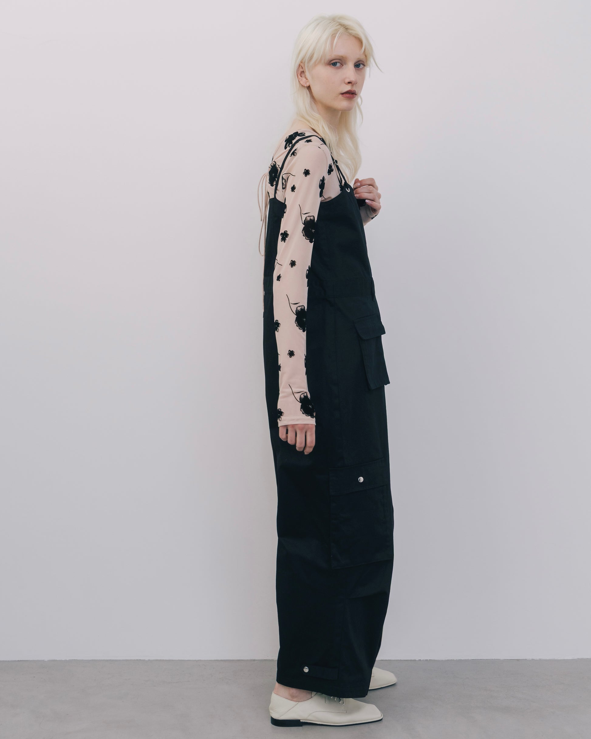程よくラフな印象を持たせながら、全体的にデザイン性を効かせたカーゴオールインワン。