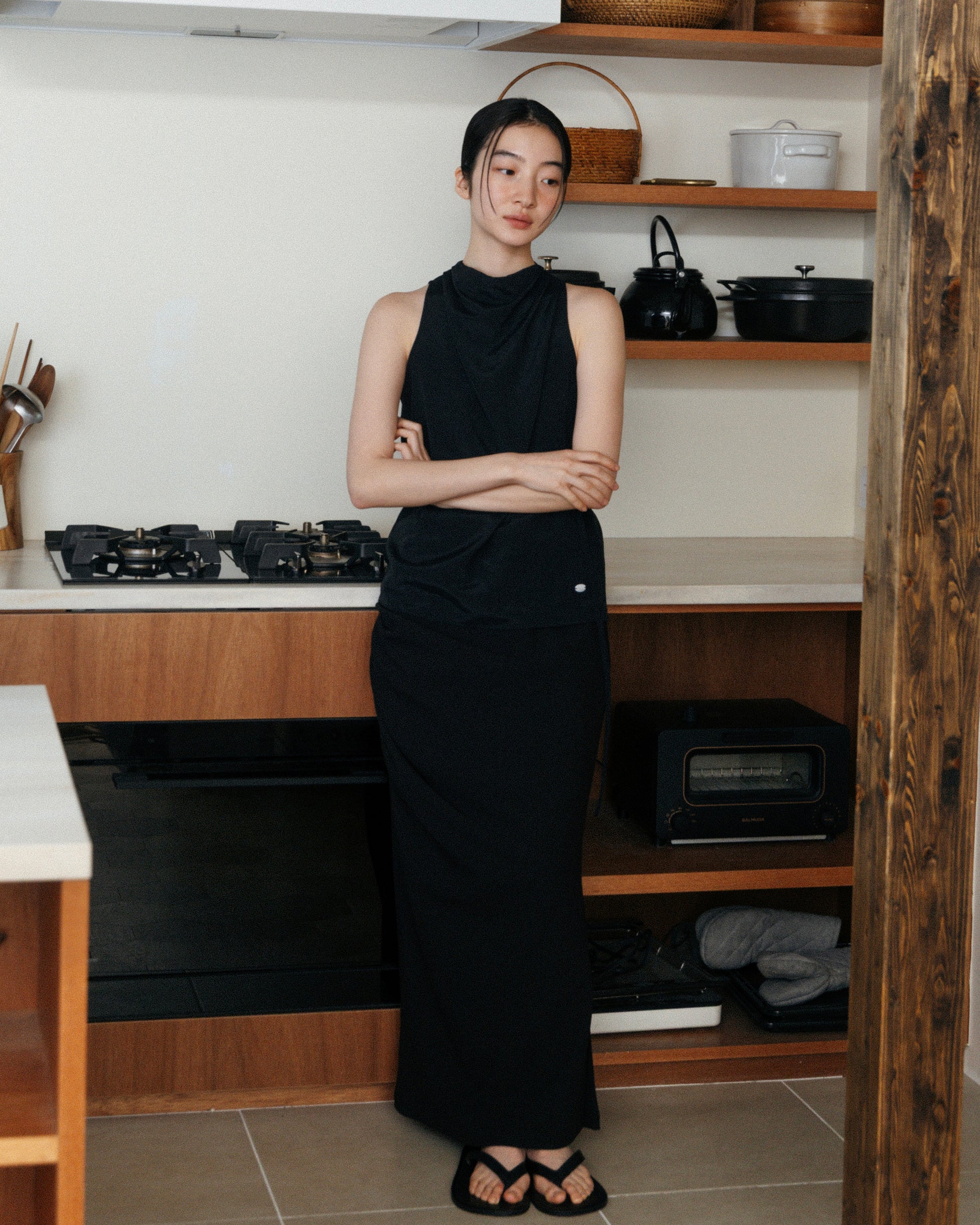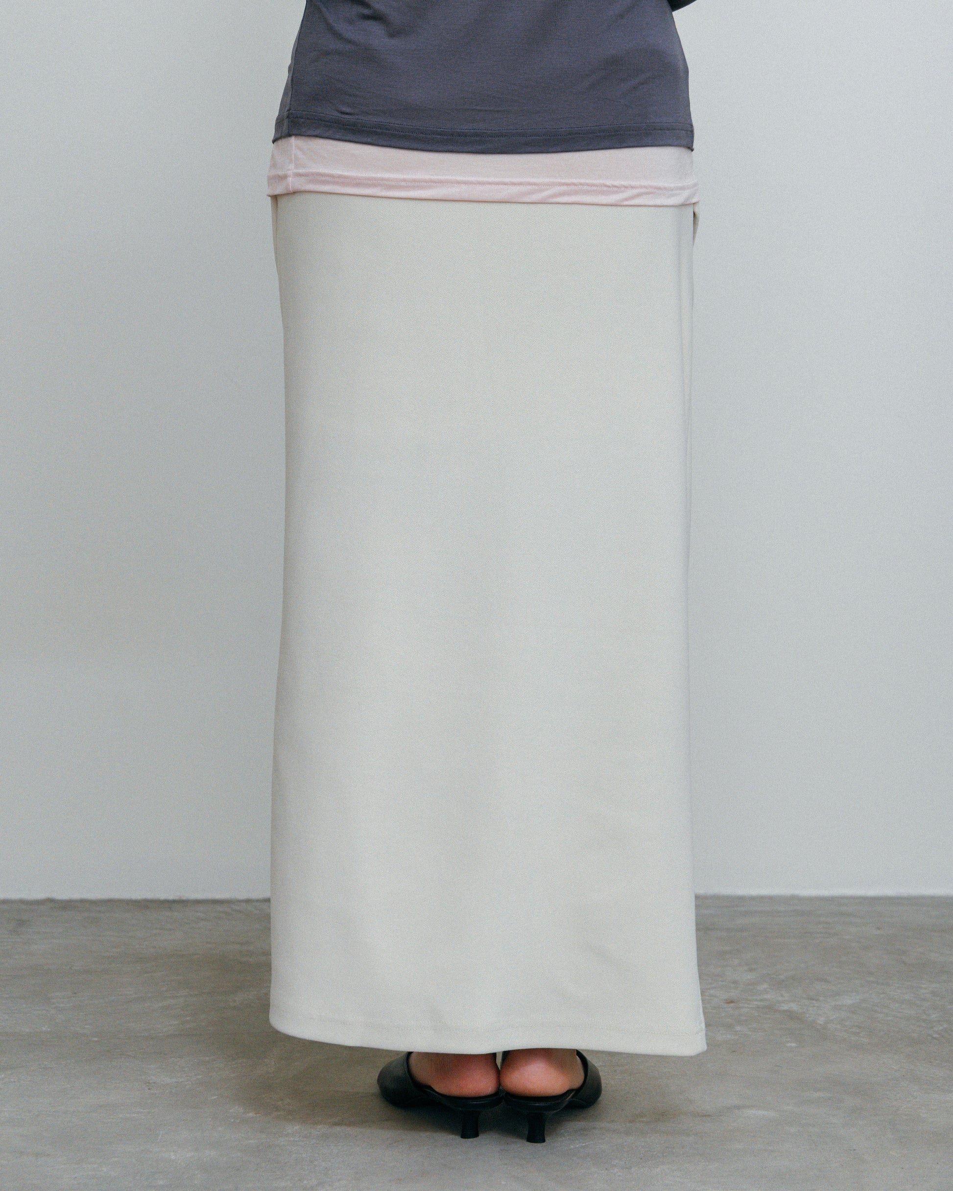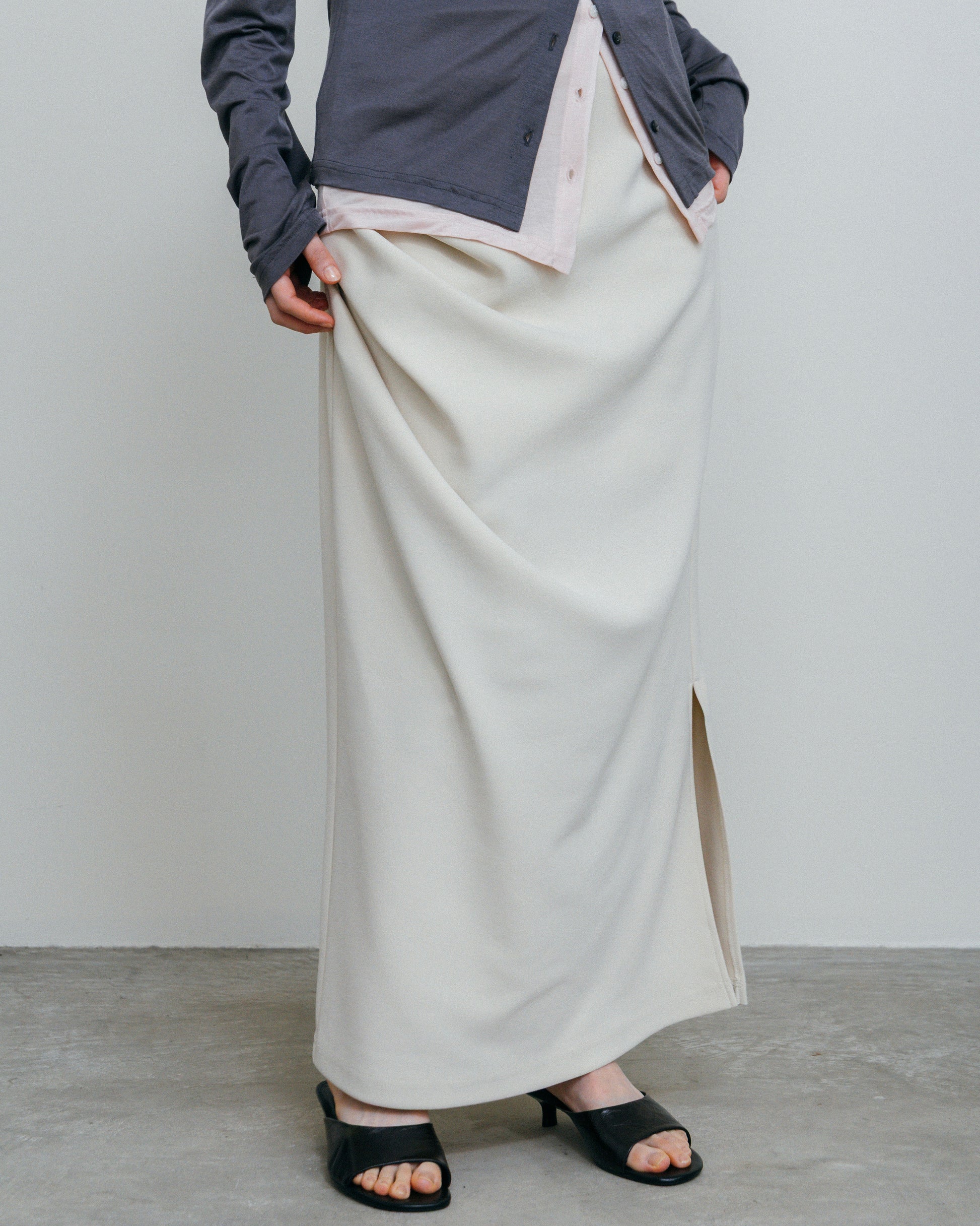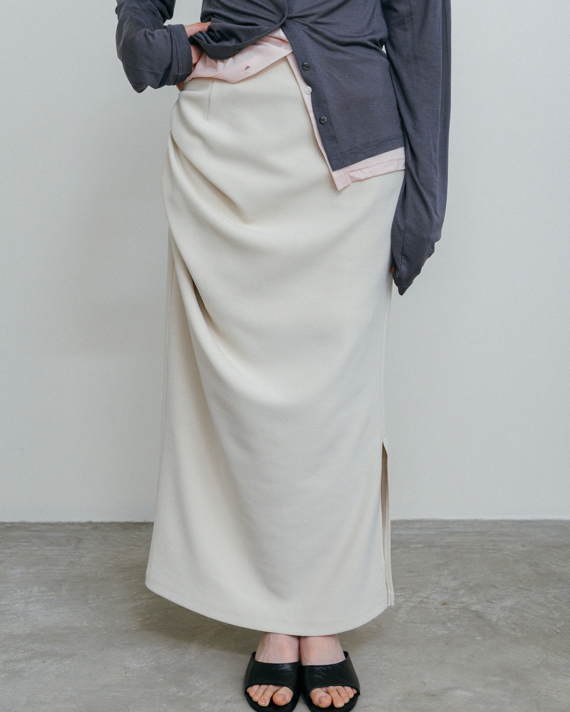 流れるようなドレープが、腰まわりに陰影をつくるロングスカート。