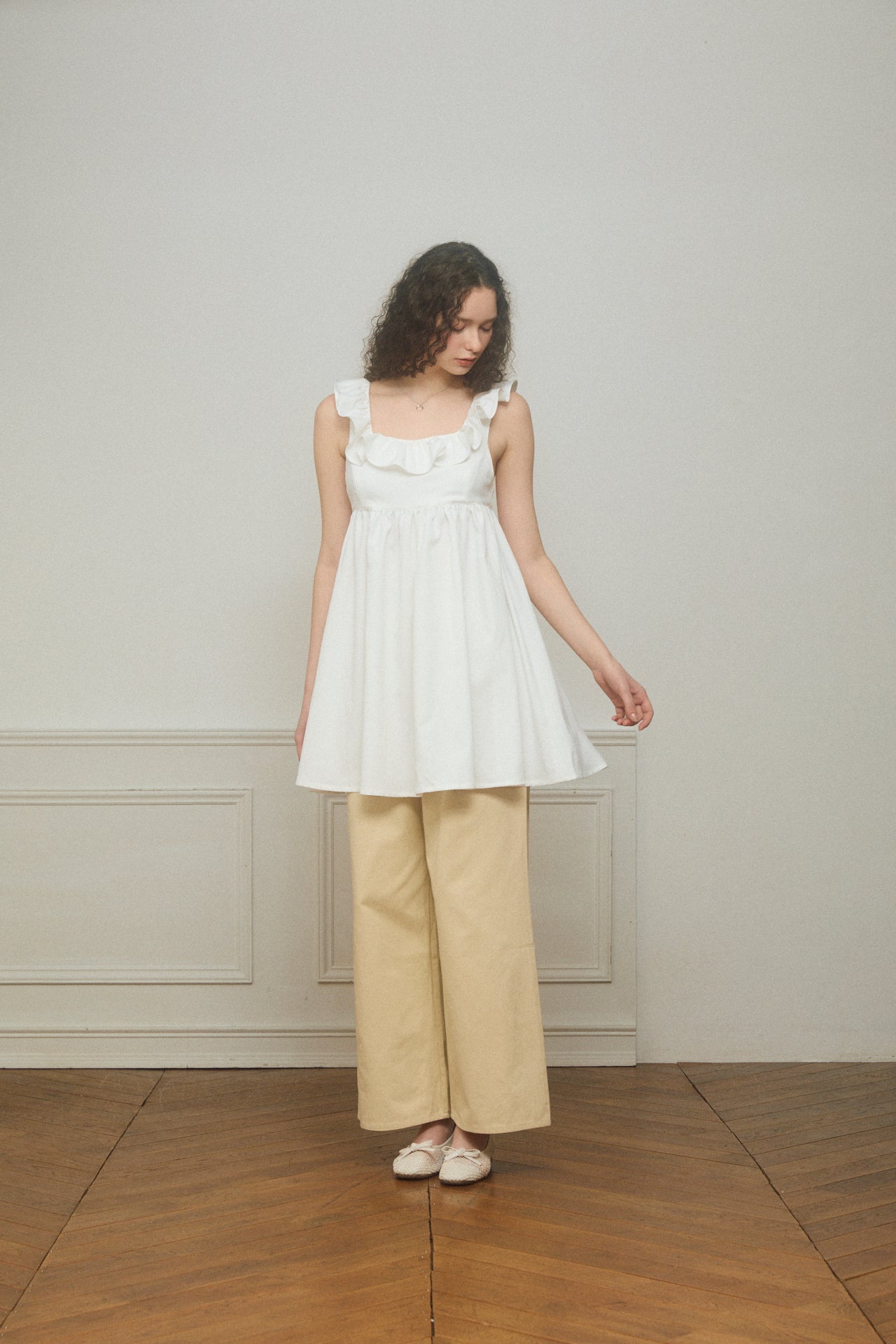 デコルテラインを華やかに見せるスクエアネックに立体感のあるフリルをあしらったミニワンピース。甘さのあるディティールながら、落ち感のある素材とシンプルなシルエットで、大人でも取り入れやすいバランスに仕上げました。