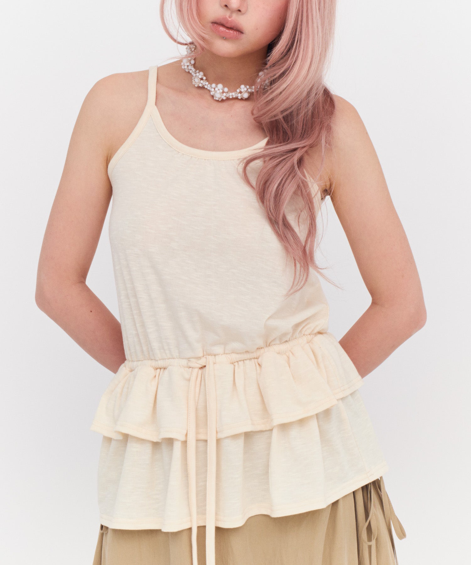 ウエスト部分にあしらったフリルがデザインポイント。さりげない可愛さと女性らしさがあり、ウエスト部分には軽くゴムと紐を入れることで、着丈の調整が可能。身長やスタイリングに合わせてバランス良く着こなせます。
