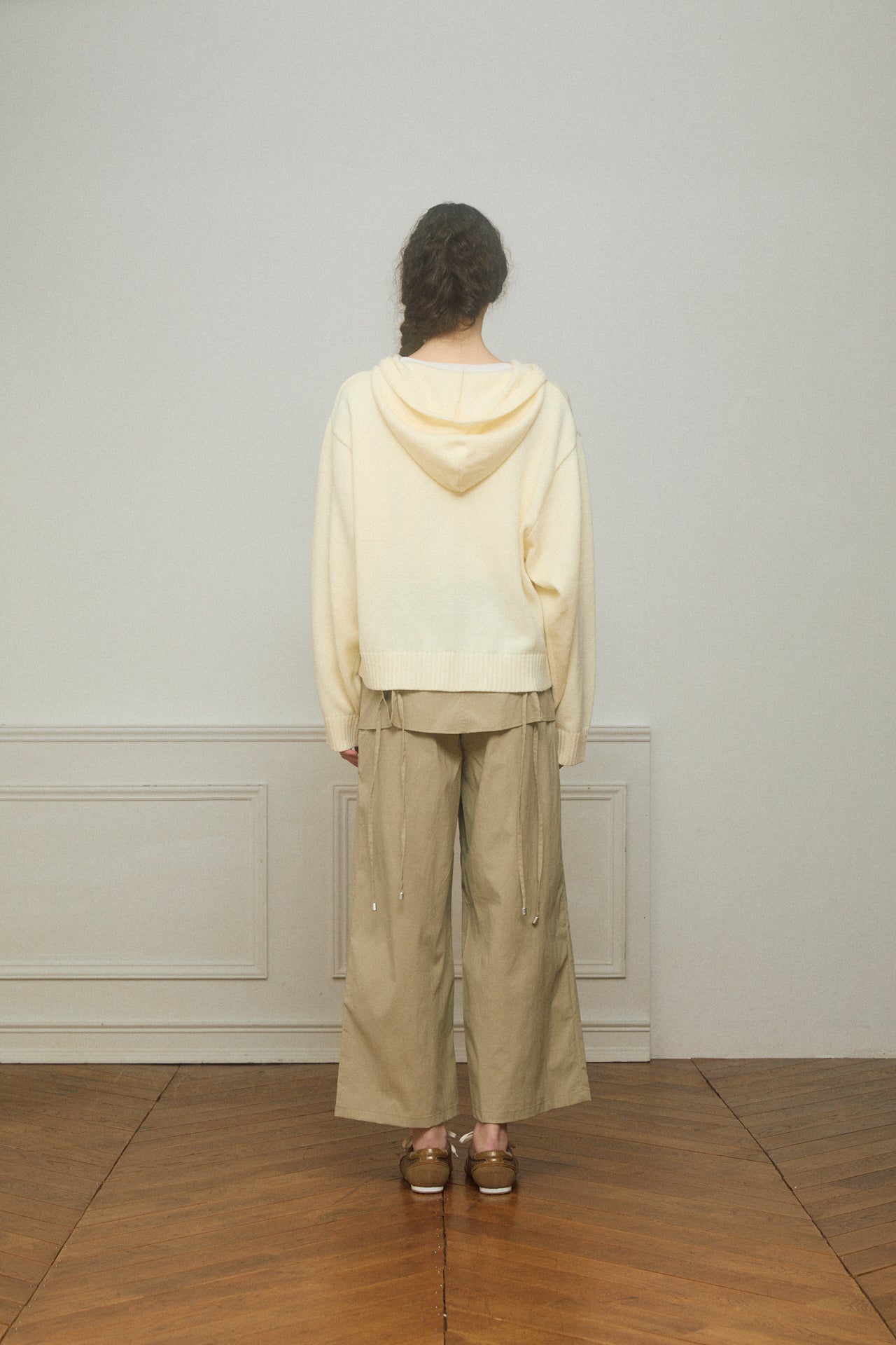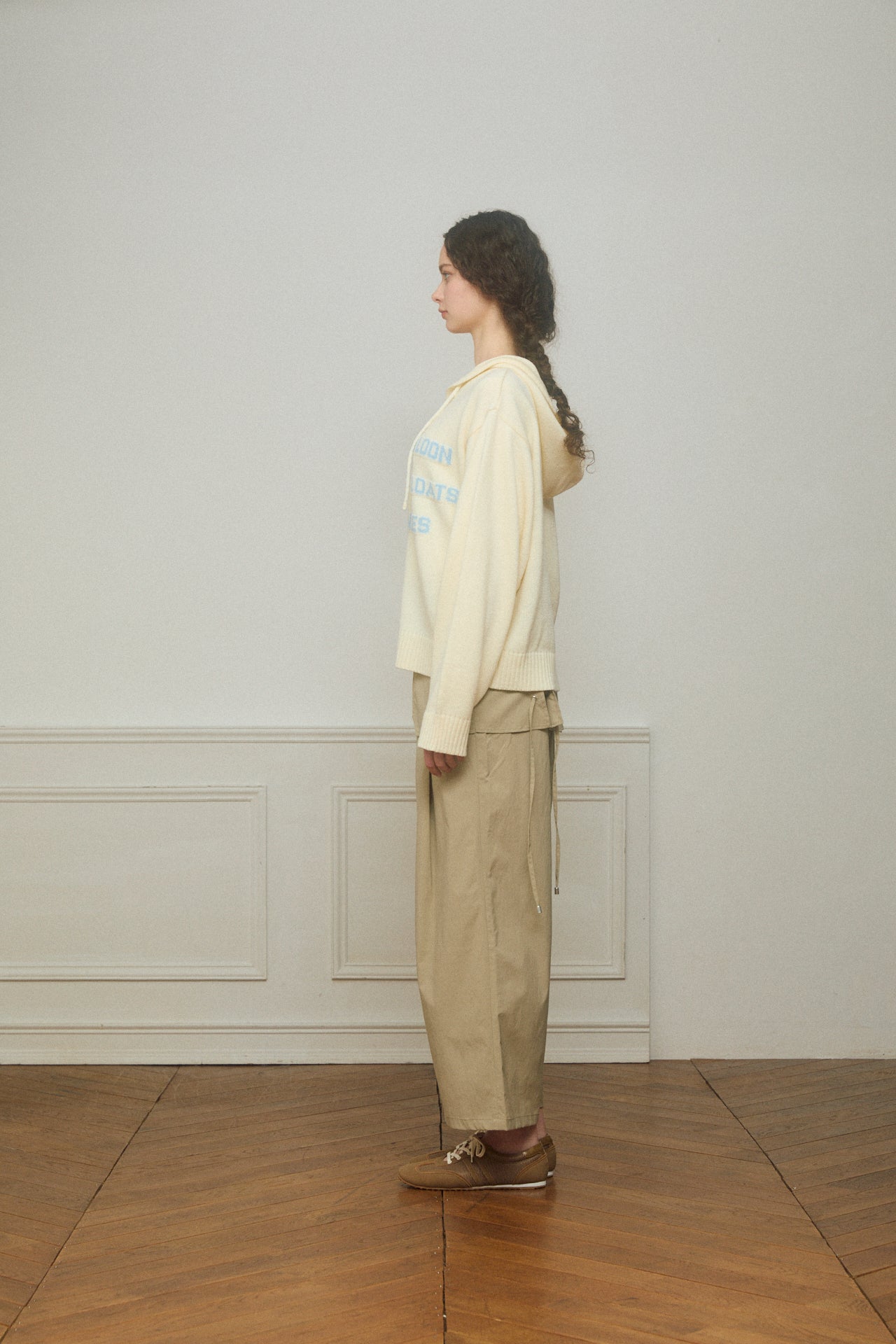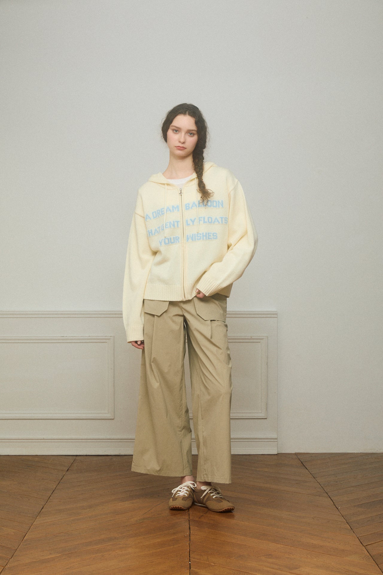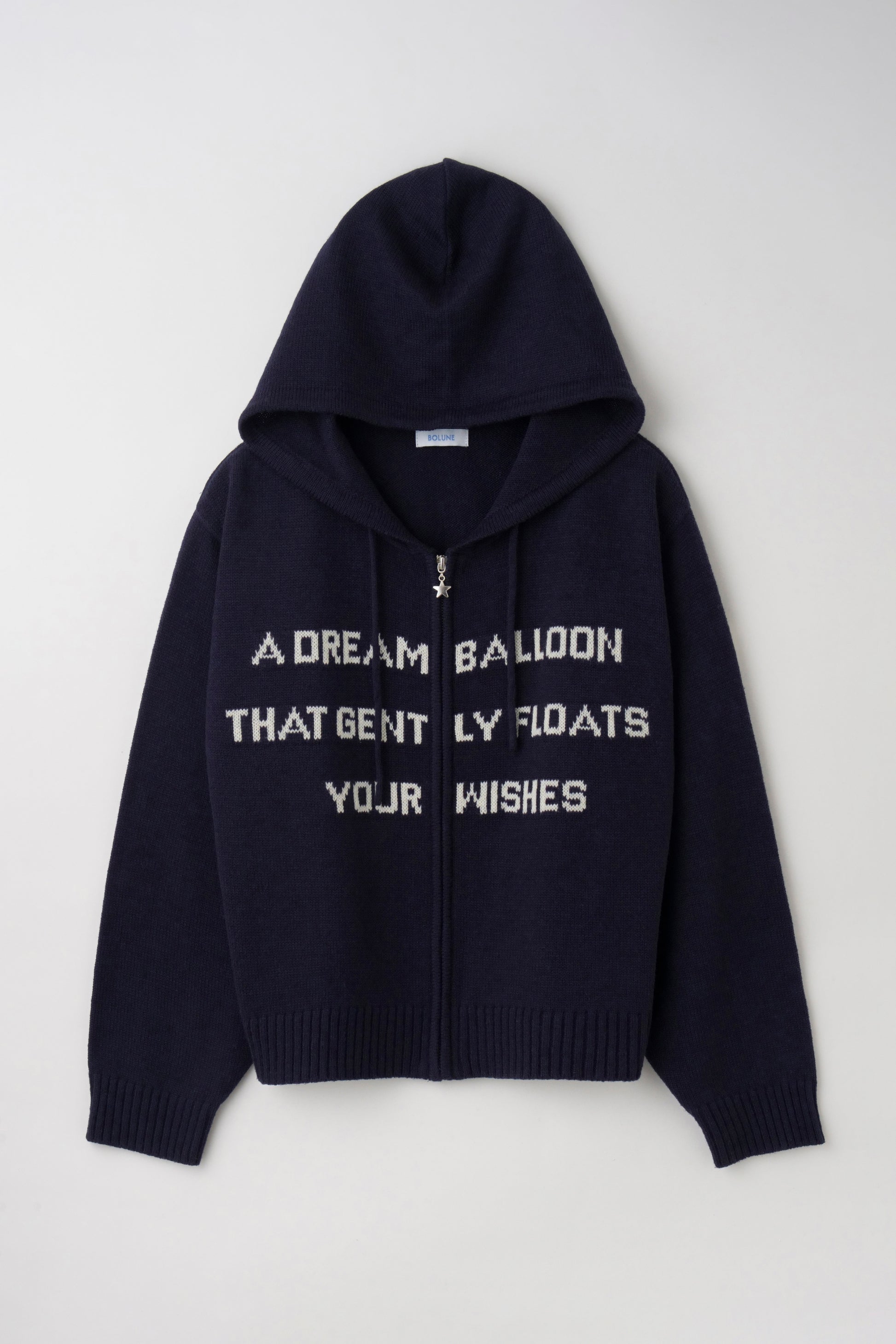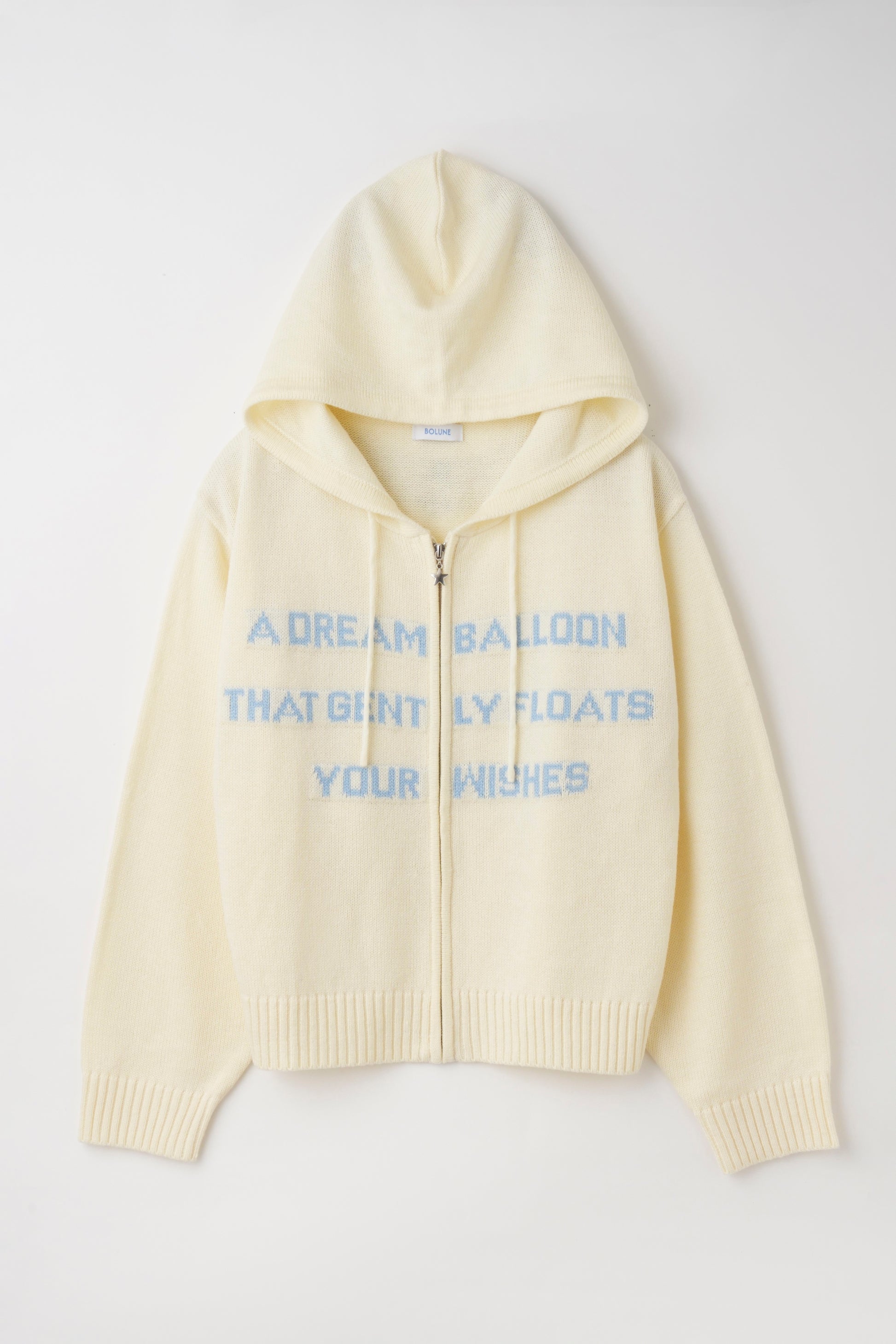プリントではなくニット編みであしらったレタリングがスタイリングに柔らかさを演出してくれるニットフーディー。ジップ部分には星モチーフのチャームをあしらい、さりげないアクセントに。ニット素材ならではの落ち感でラフになりすぎない抜け感を楽しめます。