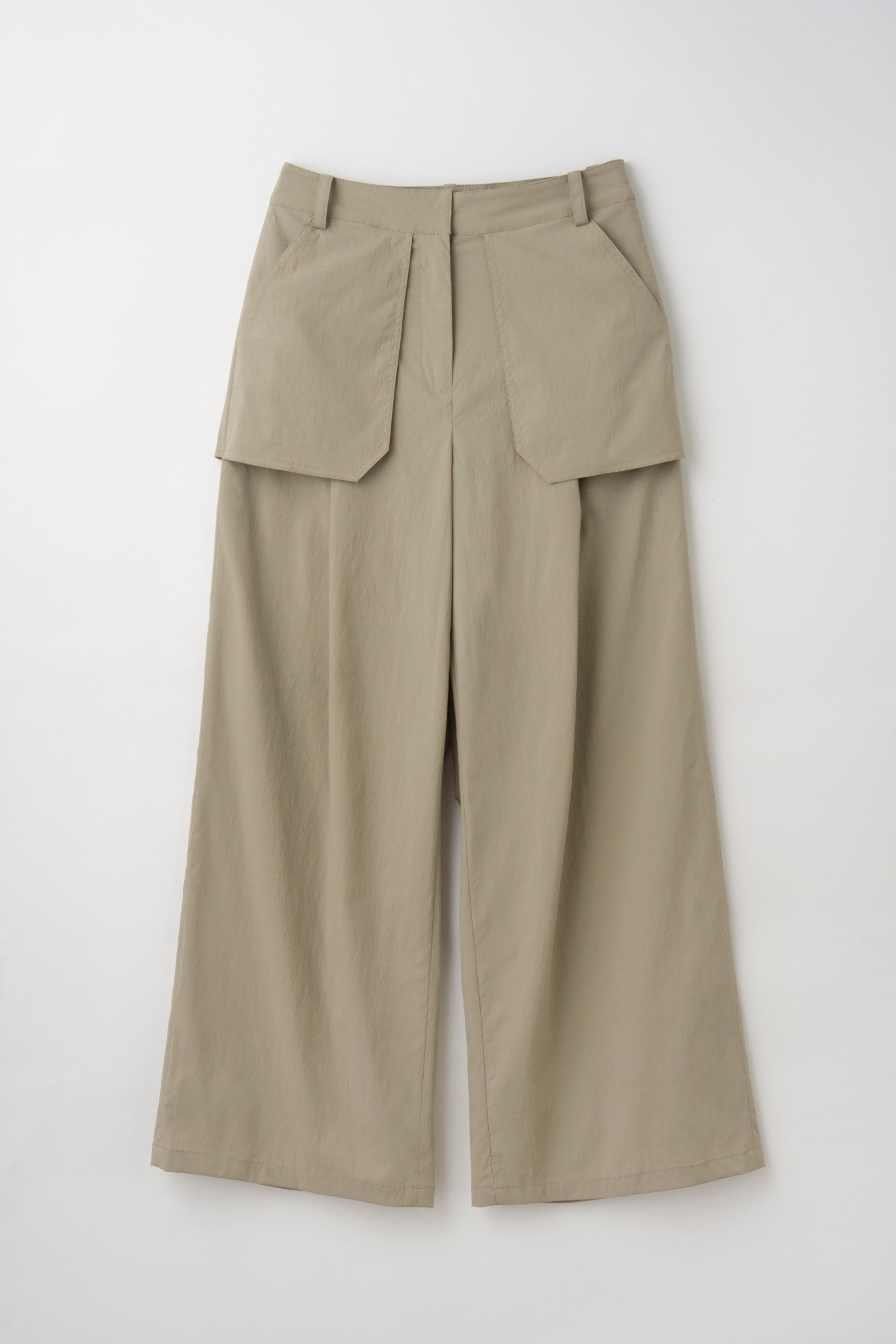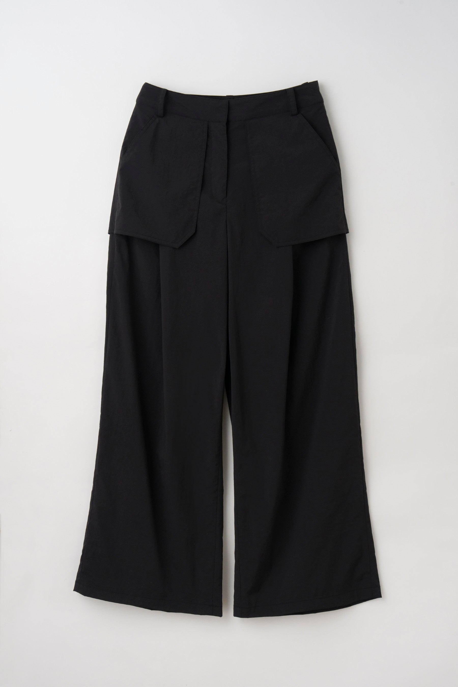 スカートをレイヤードしたようなデザインでシンプルになりがちなパンツスタイルに奥行きをプラス。