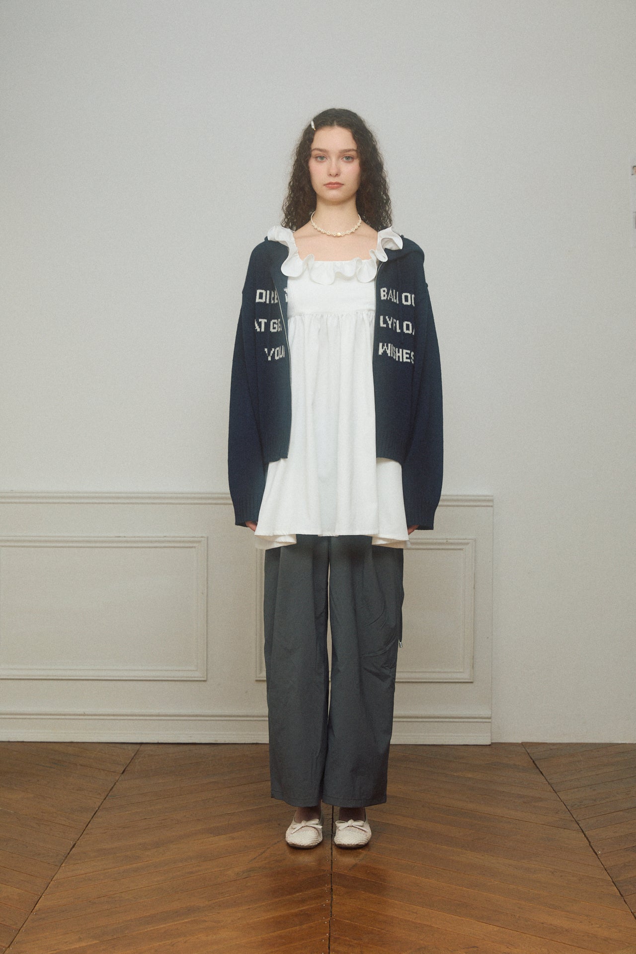 軽やかなナイロン素材と裾に向かって程よく広がるデザインでボリューム感を抑えつつすっきりとしたシルエットに。両サイドのレースアップディティールが特別感を演出します。
